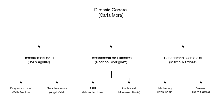 Disseny de l’estructura organitzativa de l’empresa 09/01/202611/12/2025 by Ilecina Per plasmar com ens imaginem l’empresa fictícia hem dissenyat el següent organigrama: